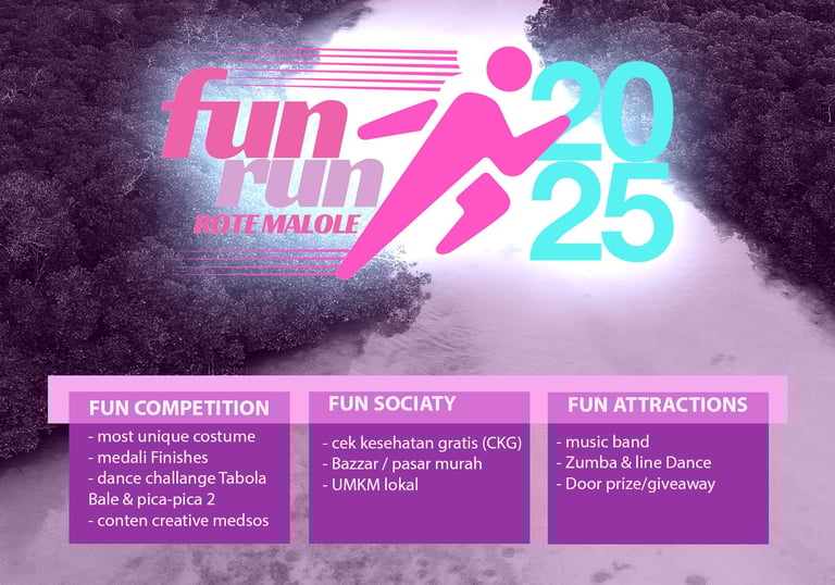 - pengambilan race pack pd tgl 13&14 November 2025, jam kerja 09:00 sd 16:00 wita, bertempat di kantor Disbudpar rote Ndao jln Civic Center Lekunik - Baa